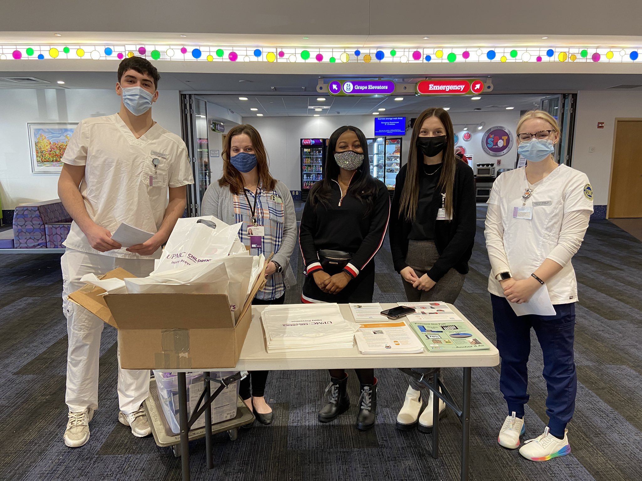 Caption: Injury prevention staff and nursing students from Carlow University hand out information and furniture anchors at Children's Hospital of Pittsburgh (https://twitter.com/SafeKidsAC/status/1488152487362191366)