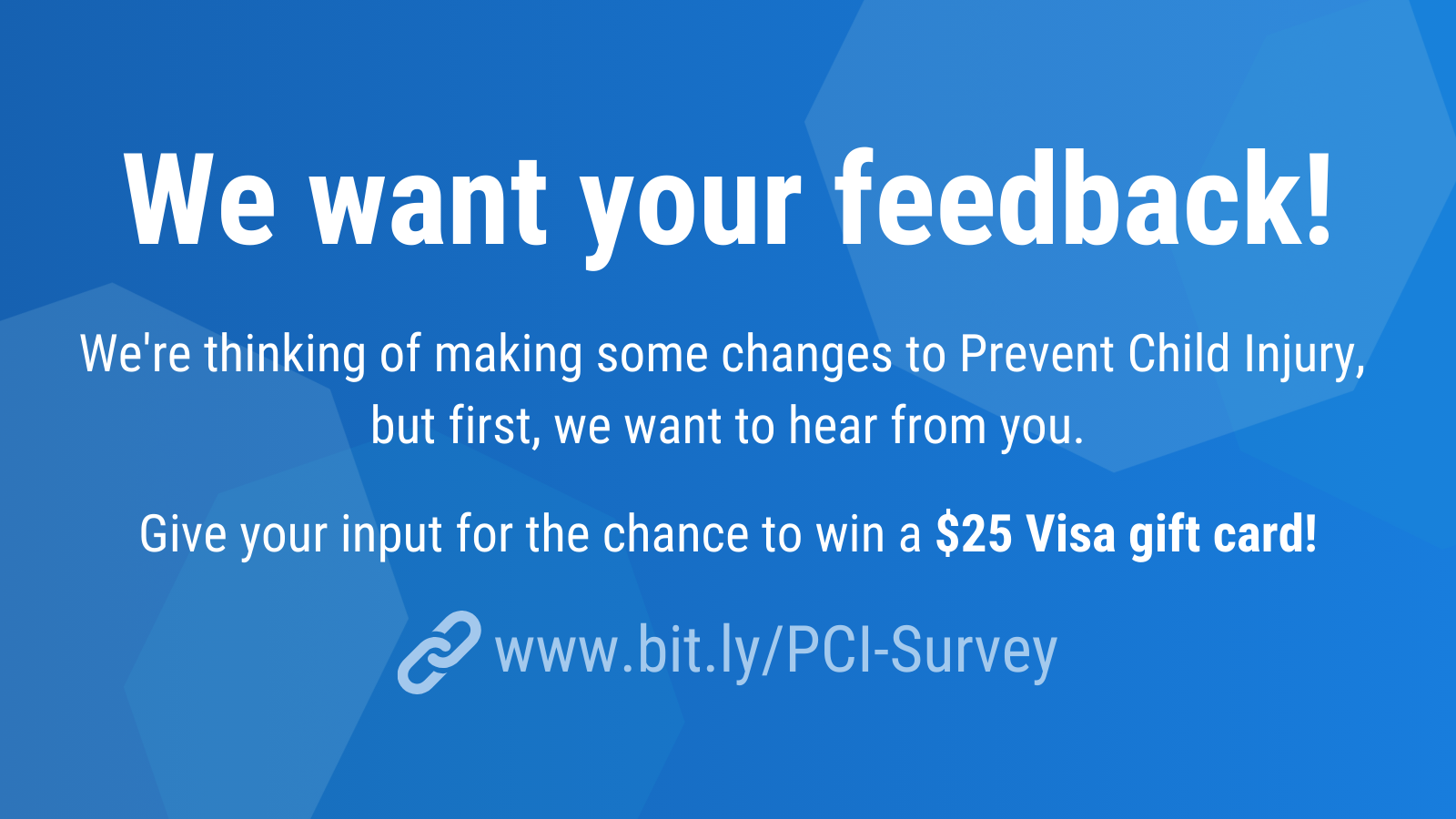 We're thinking of making some changes to Prevent Child Injury, but first, we want to hear from you. We're looking for feedback from our membership and those who use our materials to learn what you like about our program, what you might change about our program, and a little bit more about who you are as an individual or organization.