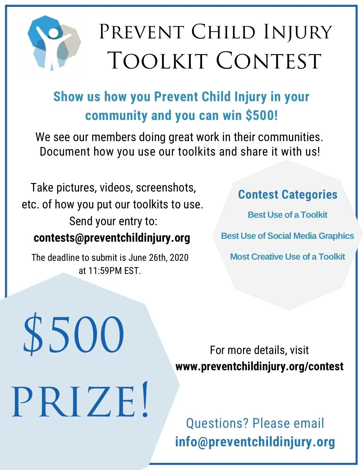 Our contest is open until June 29th, 2020. Read more about the contest here. Please send submissions to contests@preventchildinjury.org.