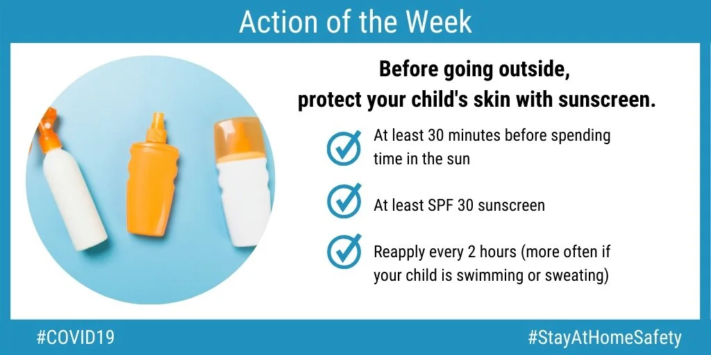 Every Monday, we are promoting a new action that each family can take to keep their children safer while social distancing. This week, we want every family to protect their children’s skin with sunscreen. When applying sunscreen, it’s important to put it on at least 30 minutes before spending time in the sun. Make sure it is at least SPF 30, and reapply every 2 hours (apply more often if your child is sweating or swimming). For more information about sun safety and sunscreen, check out this page from HealthyChildren.org.