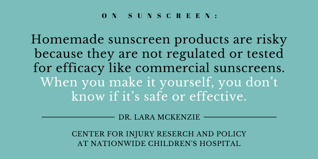 To avoid heading to the store, some parents may be tempted to make “homemade” sunscreen to protect their child’s skin from harmful rays. It’s important to resist the urge to get creative — with homemade sunscreen, you can’t be sure that it is safe or effective. Homemade products are not regulated or tested like the products you can buy at the store.