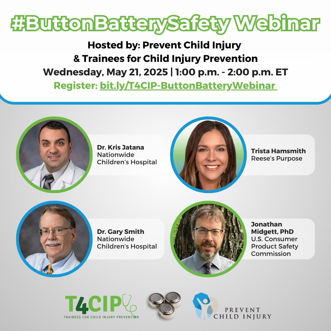 Join Drs. Kris Jatana and Gary Smith from Nationwide Children's Hospital, US CPSC Consumer Ombudsman Jonathan Midgett, PhD, and Trista Hamsmith from Reese's Purpose for an hour-long webinar about button battery safety, hosted by Trainees for Child Injury Prevention and Prevent Child Injury.