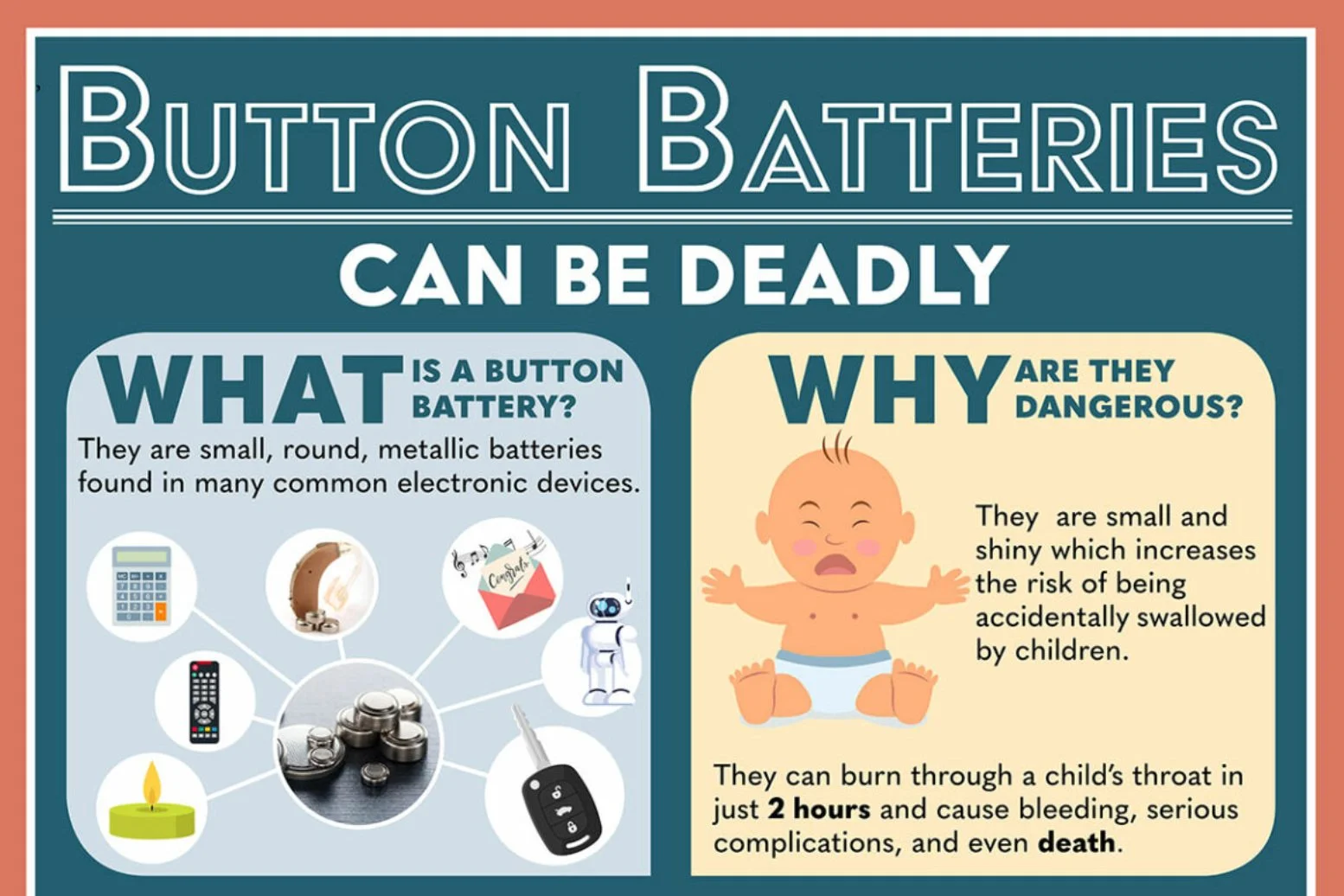 Button batteries can cause serious internal injuries in as little as two hours.